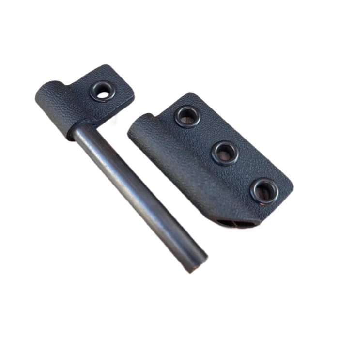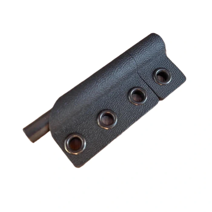 Peilio apvalkalo dangtelį galima įsigyti su ąselėmis vienoje pusėje ir kilpomis abiejose pusėse. Velcro puikiai tinka pritvirtinti peilį prie kuprinės dirželio. Be Kydex apvalkalo galiu pritvirtinti priešgaisrinio plieno laikiklį, pasirinktinai su ugniai atspariu plienu (80 mm arba 100 mm ilgio).